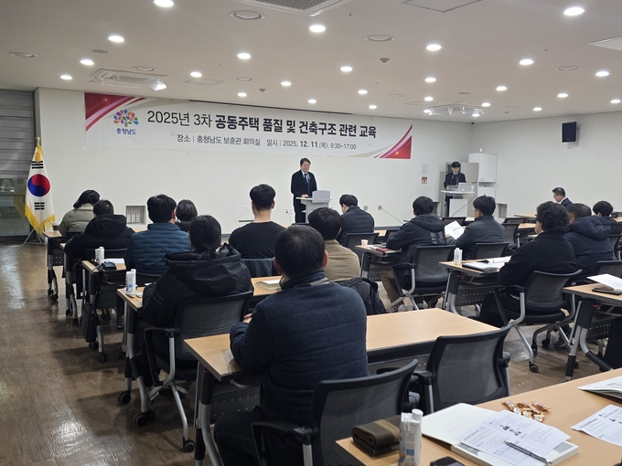 도는 11일 충남보훈관에서 충남지역건축안전센터 주관으로 감리업무 종사자, 현장 실무자, 도·시군 공무원 등 110여 명이 참석한 가운데 ‘2025년 제3차 공동주택 품질 및 구조관련 교육’을 실시했다.