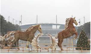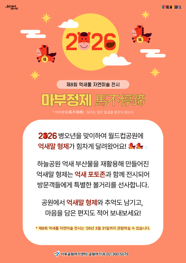 서울시 서부공원여가센터는 2026년 병오년을 맞이하여 월드컵공원(평화의 공원) 유니세프광장에서 제8회 억새풀 자연미술 전시를 내년 3월 31일까지 운영한다고 밝혔다. 내년은 붉은 말의 해로 <마부정제(馬不停蹄)>의 의미를 담은 억새말 형제 조형물을 선보인다.