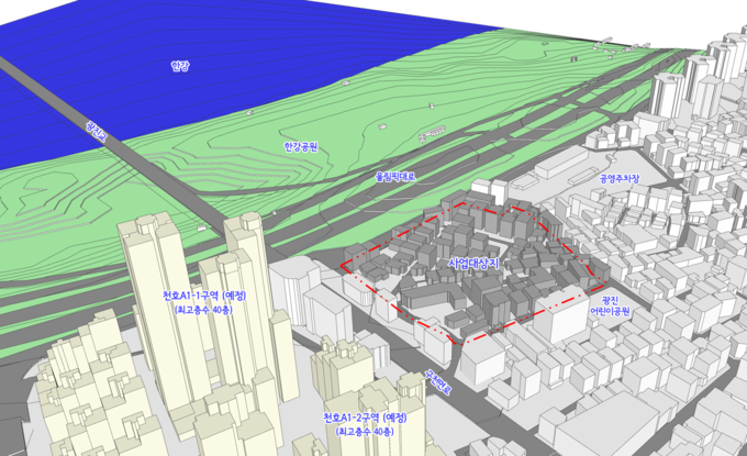 특히, ‘한강변 관리기본계획 가이드라인’의 선사로 그린웨이 조성 및 연결을 위한 보도부속형 전면공지(3m)를 설정하여 보행공간을 확보하고, 한강변 도시경관을 고려하여 건축한계선을 설정함으로써 열린 조망축을 확보하고 주가로변 활성화시설 배치를 통해 쾌적하고 활기찬 주거환경을 조성할 예정이다.