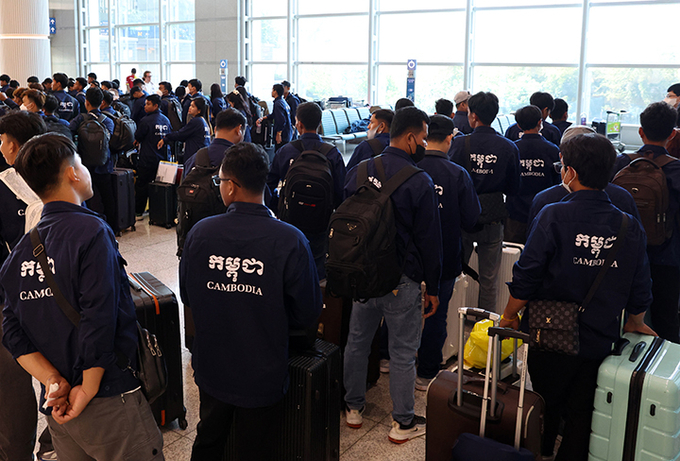 인천공항에서 E9비자로 입국한 외국인 노동자들이 이동을 하기위해 줄지어 기다리고 있다. 2025.5.27 (ⓒ뉴스1)