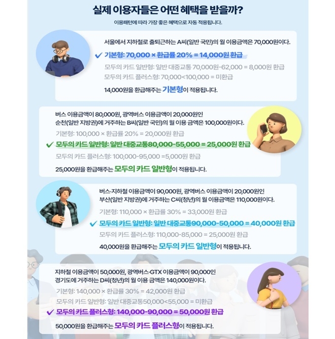특히 입학, 취업, 방학 및 휴가 등으로 이용자의 생활패턴이 달마다 다른 점을 고려해 사전에 기본형(기존 K-패스 환급방식)이나 모두의 카드 환급 방식 중 하나를 선택하는 것이 아니라, 사후에 K-패스 시스템에서 해당 월의 이용 금액을 합산해 환급 혜택이 가장 큰 방식을 자동 적용한다.