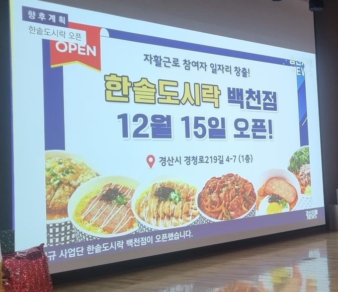 [경산/김근해기자] 경북경산지역자활센터(센터장 손석기)는 15일 지역 주민의 자립과 경제활동 참여 기회 확대를 위하여 신규 자활근로사업단 「한솥도시락 경산 백천점」을 오픈했다.