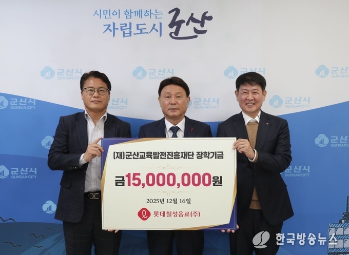 [군산/김주창기자] 롯데칠성음료(주)(대표 박윤기)는 16일 군산시청을 찾아 지역의 교육 발전을 위해 써달라며 장학금 1,500만 원을 군산교육발전진흥재단에 기탁했다.
