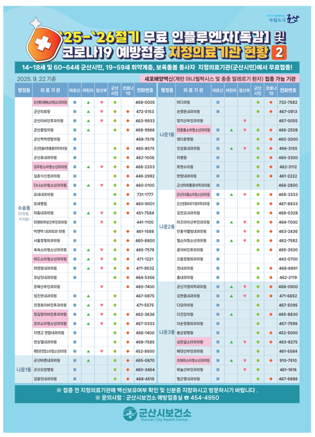 한편 예방접종은 주소지와 관계없이 가까운 위탁 의료기관에서 가능하며, 지정 의료기관은 예방접종도우미 누리집(nip.kdca.go.kr)과 군산시보건소 누리집(gunsan.go.kr/health)에서 확인할 수 있다.