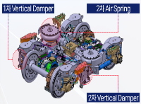 ❸ (주행안전성 및 승차감 개선) 구동 대차의 공기스프링, 댐퍼(완충기) 등 현가장치(Suspension System) 최적화 설계를 통해 횡방향 진동 가속도를 30% 이상 감소(9m/s2 → 6m/s2 이하)시키고, 유럽 기술표준(EN)에서 정한 최고 수준의 승차감 지수(Nmv) 1.14~1.87(실내 측정 위치별)을 달성하였다.