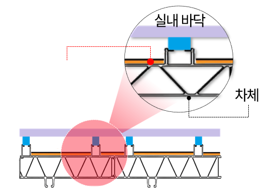 ❹ (실내소음 저감) 차량 주행장치, 공력 소음* 등 다양한 소음원 차단을 위해 바닥, 측벽, 천장 등에 차체 압출재 구조 최적화 및 복합 차음재 적용으로 68~73dB을 달성하여 KTX-청룡 대비 2dB을 저감**시켰으며, 이는 해외 고속차량(72~76dB) 대비 동등 이상 수준으로 평가된다.
