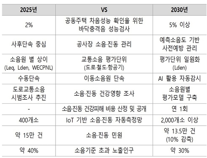특히 2030년까지 소음 환경기준 초과 노출인구를 현재보다 10% 줄이고, 연간 15만여 건에 달하는 소음·진동 민원 역시 10% 감축하겠다는 구체적인 목표를 제시했다.