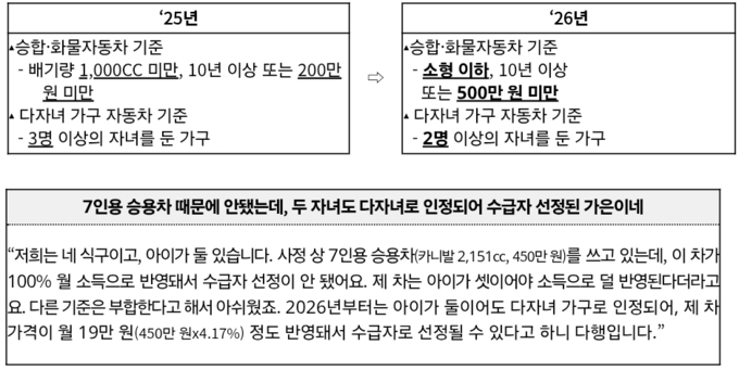 2026년부터는 소형 이하이면서 10년 이상 또는 500만 원 미만인 승합·화물차도 일반재산 환산율이 적용되고, 2명 이상의 자녀가 있으면 다자녀 가구로 인정된다.