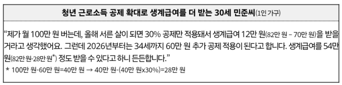 2026년부터는 청년이 스스로 근로하여 자활할 수 있는 여건을 제공하기 위하여 추가 공제 적용 대상을 29세 이하에서 34세 이하*로 확대하고, 추가 공제금을 40만 원에서 60만 원으로 인상한다.