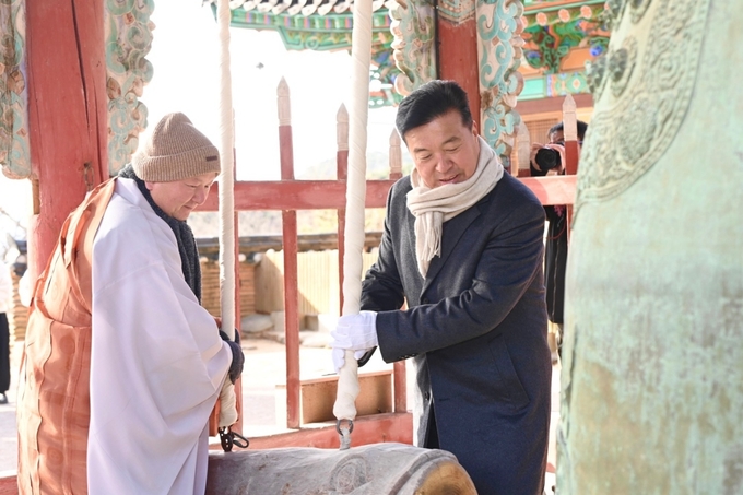 이어 수덕사 범종각에서 새해를 알리고 한 해 안녕을 기원하는 신년타종 행사에 참석했다.