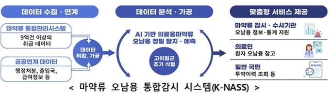 식품의약품안전처는 마약류통합관리시스템(NIMS)에 보고된 마약류 취급 데이터와 관계기관 정보를 연계·분석하는 '마약류 오남용 통합감시시스템(K-NASS)' 구축을 연내 완료한다.