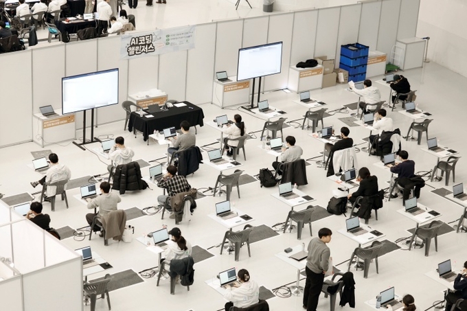 서울 중구 동대문디자인플라자(DDP)에서 열린 '2025 청년취업사관학교 AI 인재 페스티벌'에서 AI코딩 챌린저스 참가자들이 코딩작업을 하고 있다. 2025.12.2 (ⓒ뉴스1)