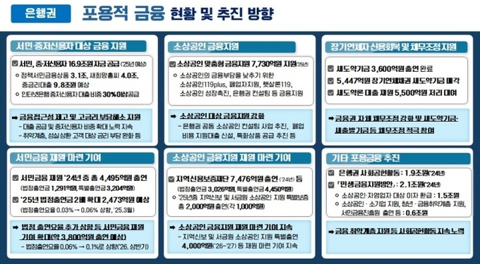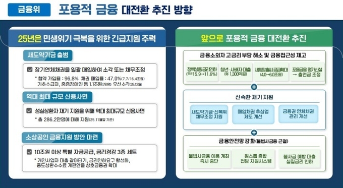 이에 더해 지난해 12월 신용대출 금리 7% 상한제 도입, 금융소외계층 긴급생활비대출 출시(1000억 원), 제2금융권→은행 갈아타기 대출 출시(2000억 원), 연체 6년 초과·1000만 원 이하 대출 추심 중단 등을 포함한 '포용금융 추가 강화방안'을 발표했다.
