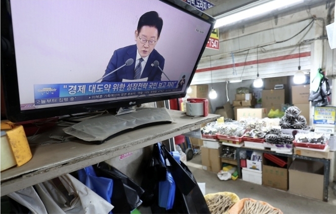 9일 서울 동대문구 경동시장에서 한 상인이 이재명 대통령의 경제성장전략 국민보고회를 시청하고 있다.(ⓒ뉴스1)