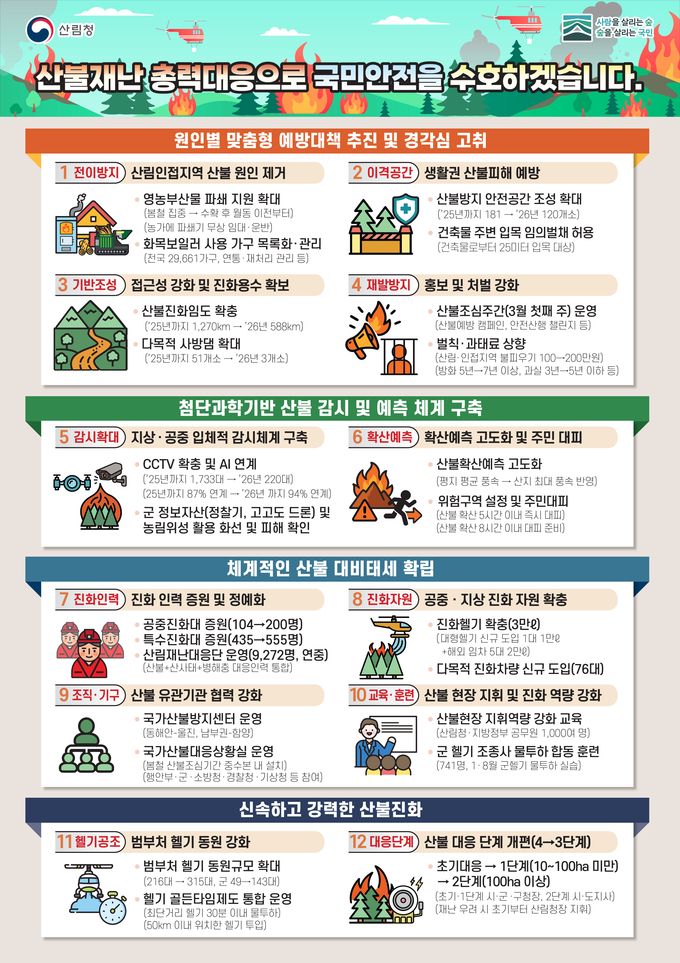 지난해와 달라지는 주요 내용으로, 산불 대응 역량 강화를 위해 진화 인력 및 자원이 대폭 확충될 예정이다. 정예 진화 인력인 공중진화대는 104명에서 200명으로, 산불재난특수진화대는 435명에서 555명으로 증원되며, 기존 산불진화차량 대비 담수량과 기동성이 대폭 향상된 다목적 산불진화차량 76대가 신규 도입돼 활용될 계획이다. 또한, 담수량 1만ℓ 용량의 대형헬기 1대가 신규 도입되고, 봄철 산불조심기간 동안에는 총 2만ℓ 용량의 중형헬기 5대를 해외에서 임차해 운영할 계획이다.