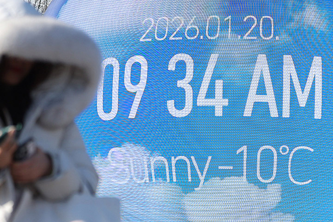 서울 송파구 미디어아트 조형물인 '더 스피어'에 표시된 실시간 온도가 영하 10도를 나타내고 있다. 2026.1.20 (ⓒ뉴스1)