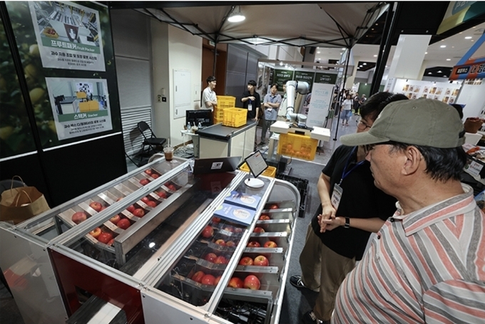 11일 오전 서귀포시 중문동 제주국제컨벤션센터에 열린 제7회 농촌융복합산업제주국제박람회 '푸파페 제주'에서 주식회사 토트(THOTH) 관계자들이 자사의 로봇 AI 기반 과일 포장 자동화 솔루션을 선보이고 있다. 2025.7.11 (사진=연합뉴스)