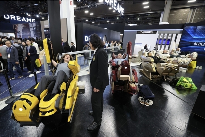 세계 최대 IT(정보기술)·가전 전시회 'CES 2026' 개막 일인 6일(현지시간) 미국 네바다주 라스베이거스 컨벤션센터(LVCC)에서 바디프렌드 부스를 찾은 관람객들이 안마기 체험을 하고 있다. 2026.1.7 (ⓒ뉴스1)