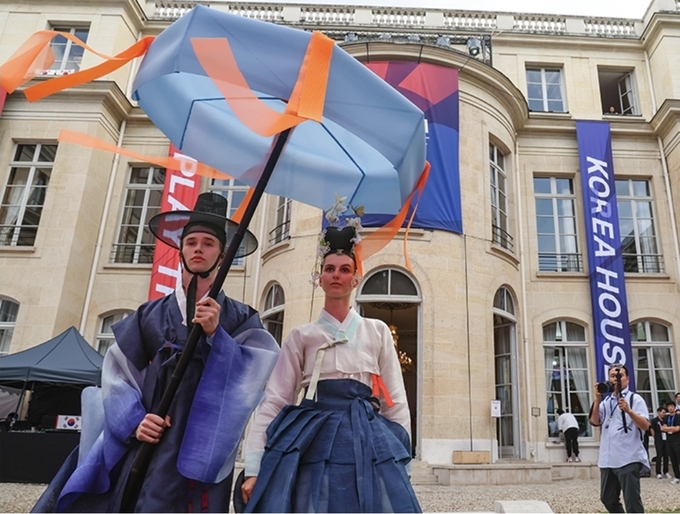 지난 2024년 파리올림픽 코리아하우스에서 '한국의 날' 행사가 열려 한국공예디자인문화진흥원이 한복 패션쇼를 선보이고 있다.2024.8.2.(ⓒ뉴스1)