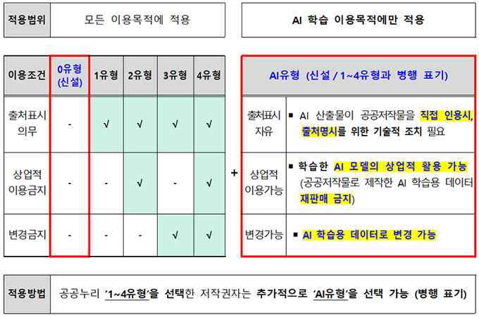 공공누리 개정에 따라 신설된 '제0유형' 및 'AI유형' 이용허락 범위(표=문체부 제공)