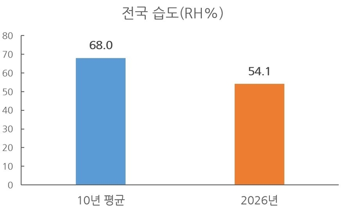 기상청 관측 결과에 따르면 올해 1월 전국 누적 강수량은 예년 대비 16.3% 수준으로 크게 감소했다. 특히 영남권을 중심으로 30일 이상 건조특보가 지속되고 있으며, 최근에는 건조 ‘경보’ 발효 지역이 확대되는 추세이다.