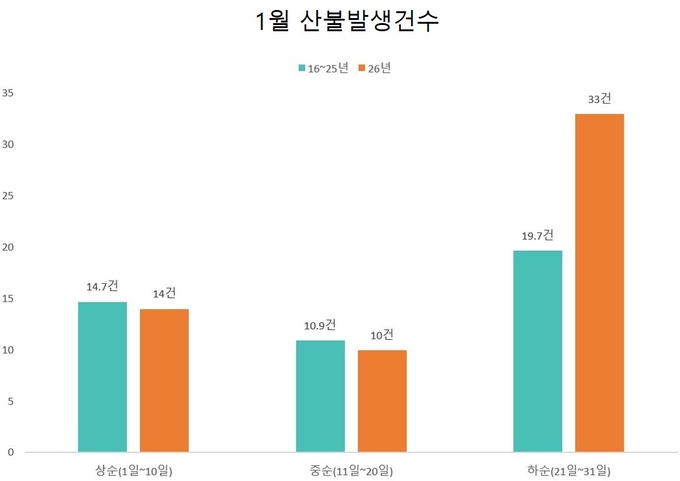 실제로 산불 통계 데이터를 분석한 결과, 올해 1월 30일까지 발생한 산불은 총 57건으로 예년(42건) 대비 35%나 증가했다. 특히 1월 산불의 약 57.8%(33건)가 하순(21~31일)에 집중적으로 발생했는데, 지난 29일에는 하루에만 10건의 산불이 발생하며, 최근 10년 중 1월 ‘일 최다 산불 발생’ 2위를 기록하기도 했다.