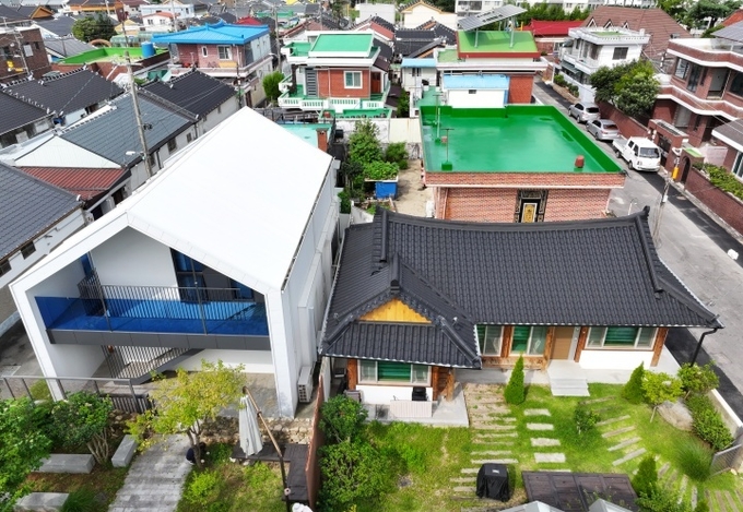 도시재생 사업으로 한옥형 폐공가와 부지를 사들여 설계 공사를 거쳐 마을호텔, 청년 임대주택, 공유 공간, 마을 정원 등을 조성한 순천시 저전동 마을호텔 '어여와' 1호와 청년 임대주택(왼쪽) 모습. 2025.9.14. (ⓒ연합뉴스)