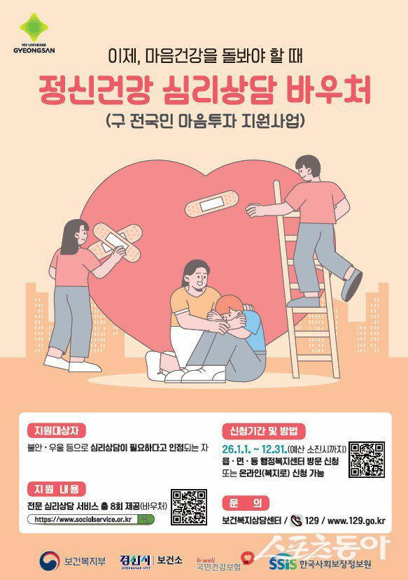 [경산/김근해기자] 경산시(시장 조현일)는 우울, 불안 등 정서적 어려움이 있는 시민에게 대화 기반의 전문심리상담 서비스를 제공하는 「정신건강 심리상담 바우처사업」을 시행한다.