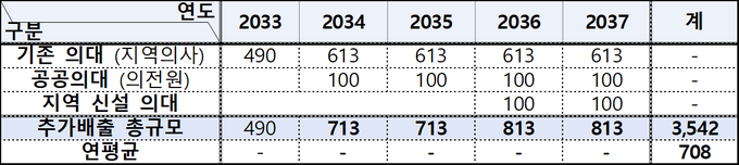보정심이 의결한 의사인력 양성규모(안)이 교육부의 각 대학별 배정을 거쳐 ’27년부터 의과대학 모집정원에 반영․시행되면 2033년부터 2037년까지 총 3,542명, 연평균 708명의 의사인력이 추가 배출된다.