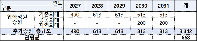 이와 함께 2027년의 경우 기존의대는 증원규모의 80% 규모(490명)를 증원하도록 해서 증원 초기 의대교육 현장의 부담을 완화할 수 있도록 하였다.