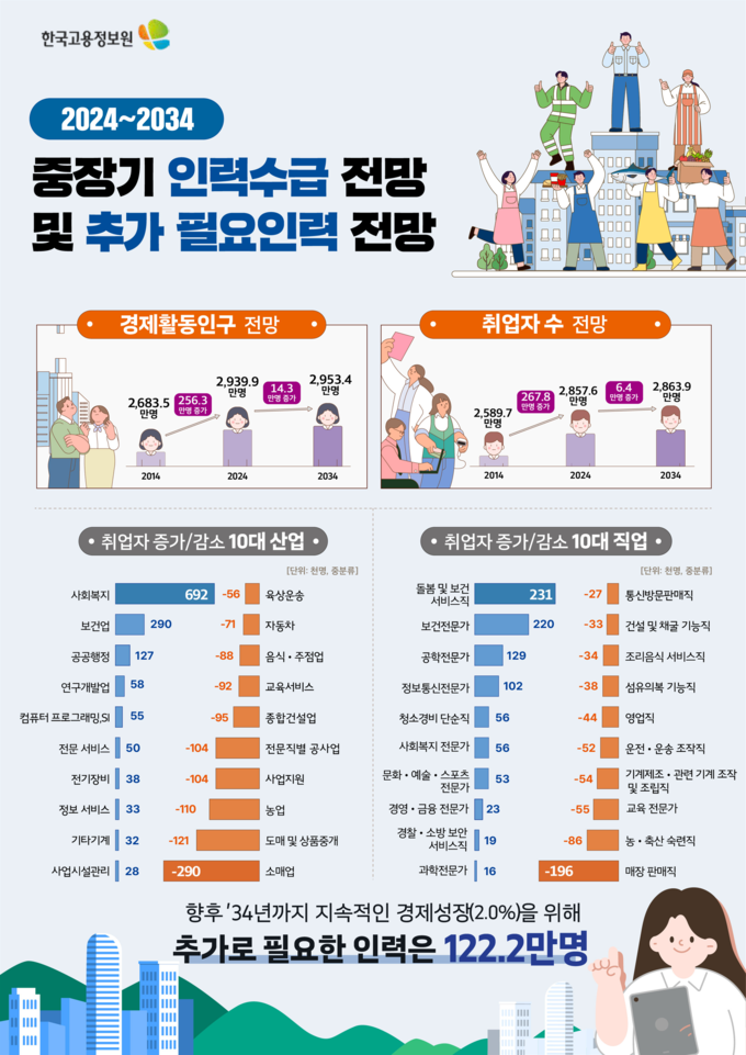 지속적인 경제성장 전망치(2.0%)를 달성하기 위해 2034년까지 추가로 필요한 인력* 규모는 122.2만 명으로 전망하였다. (※전망 전기 5.4만/전망 후기 19.1만)