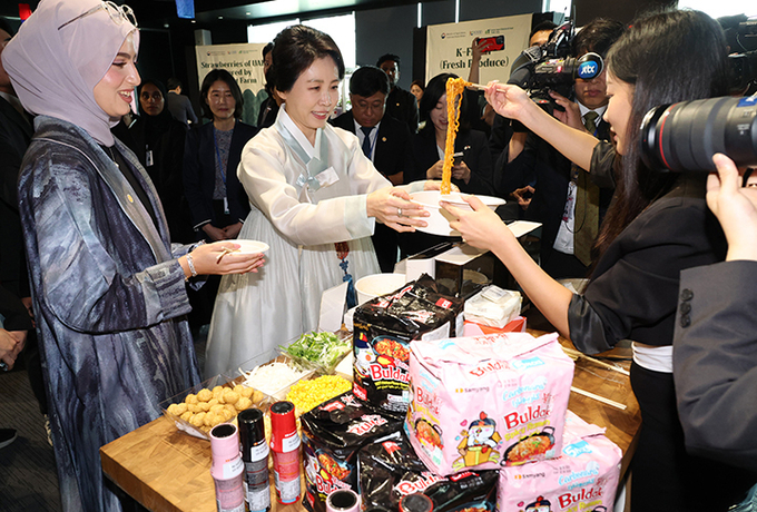 이재명 대통령과 아랍에미리트(UAE)를 국빈 방문 중인 김혜경 여사가 19일(현지시간) 아부다비 주UAE한국문화원에서 열린 할랄 K-푸드 홍보행사에서 볶음면을 시식하고 있다. 2025.11.19 (사진=연합뉴스)