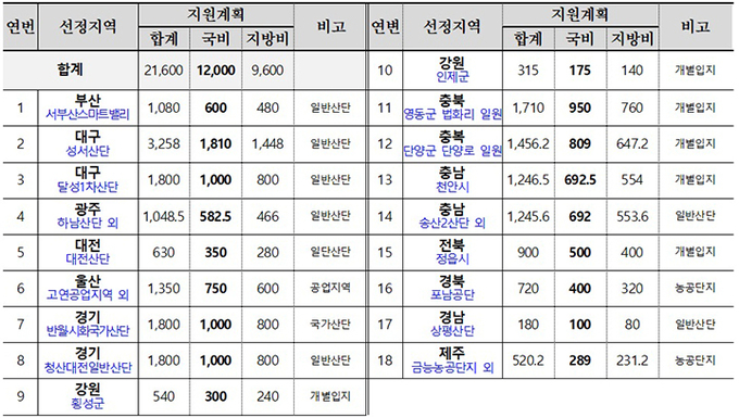 대상지는 ▲서부산스마트벨리(부산) ▲성서산단, 달성1차산단(대구) ▲하남산단(광주) ▲대전산단(대전) ▲고연공업지역(울산) ▲반월시회국가산단, 청산대전산단(경기) 등이다.