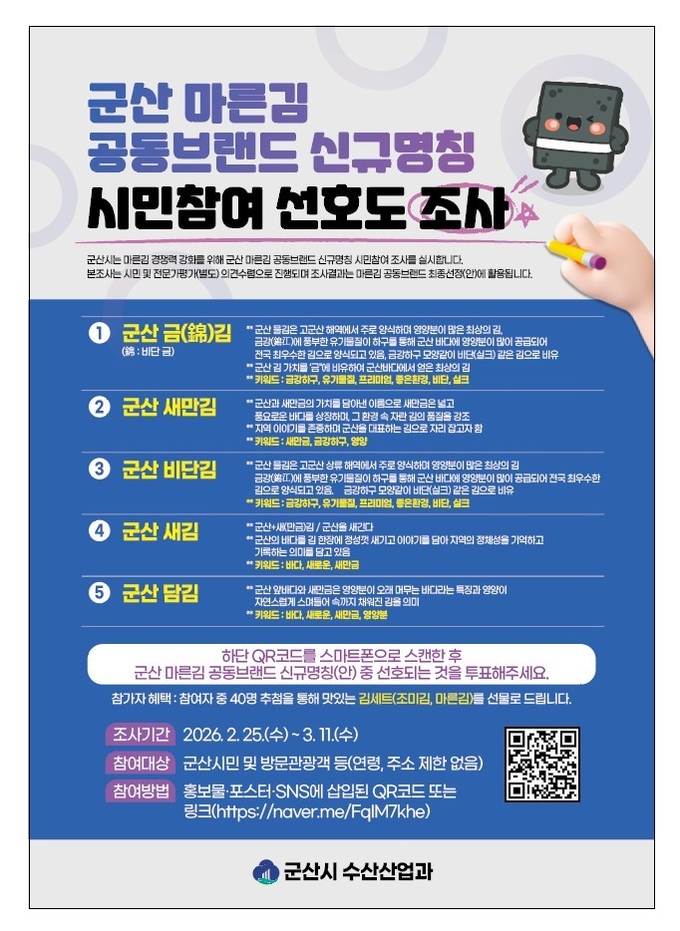 시민들은 포스터 내 QR코드 또는 온라인 링크(https://naver.me/FqIM7khe)를 통해 조사에 참여할 수 있으며, 참여자 중 40명을 추첨해 김 세트(조미김·마른김)를 증정할 예정이다.
