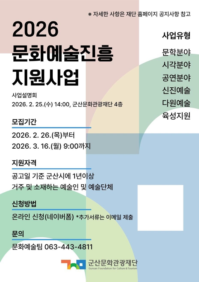 [군산/김주창기자] 군산문화관광재단(이하 재단)이 지역 예술 현장에 창작 활력을 불어넣기 위해 ‘2026년 문화예술진흥 지원사업’에 참여할 예술인과 예술단체를 공개 모집한다.