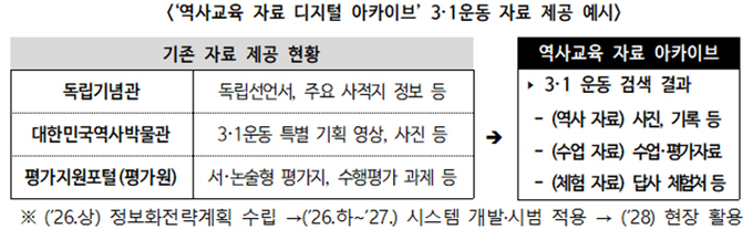 아울러 근현대 사료와 교육자료, 체험 자료 등을 교사가 수업에 즉시 활용할 수 있도록 묶음 형태로 제공하는 '역사교육 자료 아카이브'를 2027년까지 구축한다.