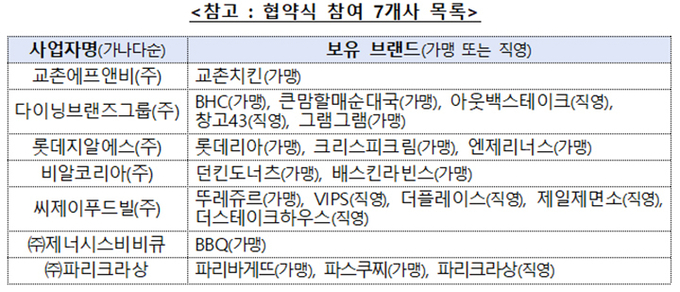 '가격인상 등 정보제공 협약' 참여 7개사 목록