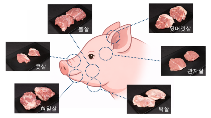 돼지의 머릿고기는 돼지 한 마리에서 약 1kg 정도만 얻을 수 있는 귀한 부위다. 볼살, 뒷머릿살, 턱살, 혀밑살, 콧살, 관자살 6개 부위로 나뉜다. 출하 체중 100~109kg 기준으로 생산량을 살펴보면, 턱살(약 323g)이 가장 많다. 이어 볼살(208g), 혀밑살(181g), 뒷머릿살(163g), 콧살(85g), 관자살(68g) 순으로 생산된다.
