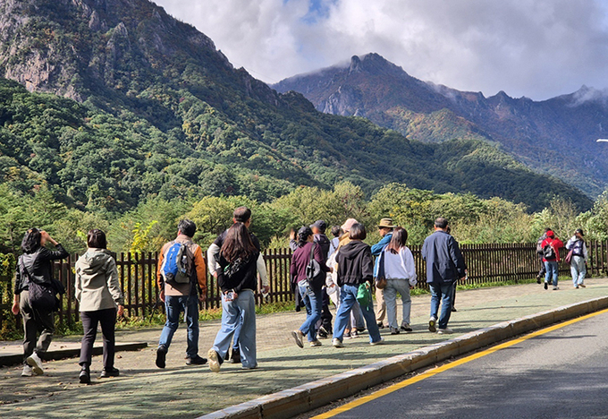 강원 속초시 설악산국립공원 입구에서 탐방객들이 줄지어 들어서고 있다. 202510.23 (ⓒ뉴스1)