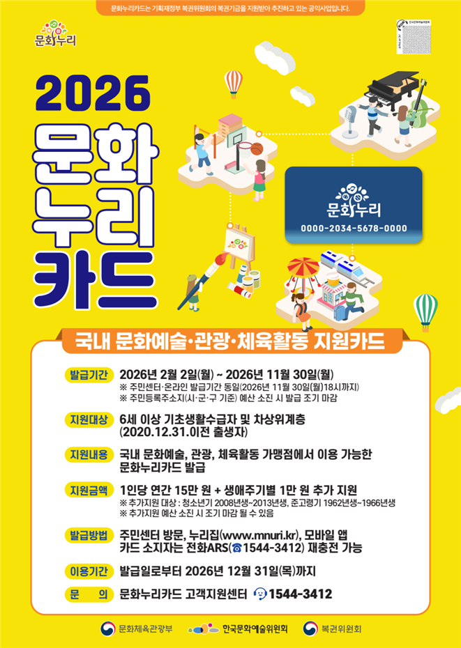 [군산/김주창기자] 군산시는 취약계층의 문화 향유 기회를 확대하고 문화격차 해소를 위해 ‘2026년 통합문화이용권(문화누리카드) 사업’을 추진한다고 밝혔다.