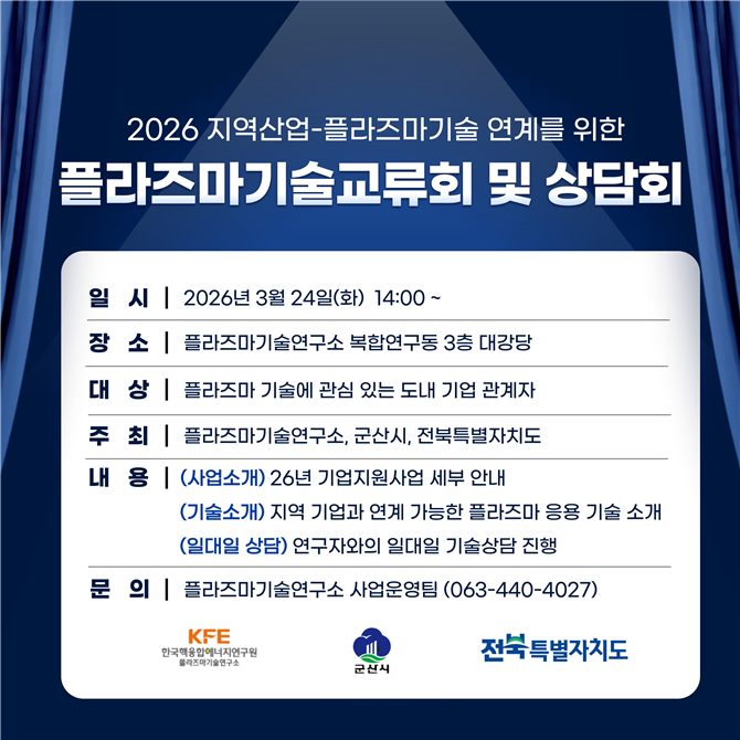 주요 프로그램으로는 산업 현장에 적용 가능한 플라즈마 기술 소개를 비롯해 기업지원사업 안내, 전문 연구원과의 1:1 맞춤형 컨설팅이 진행될 예정이다.