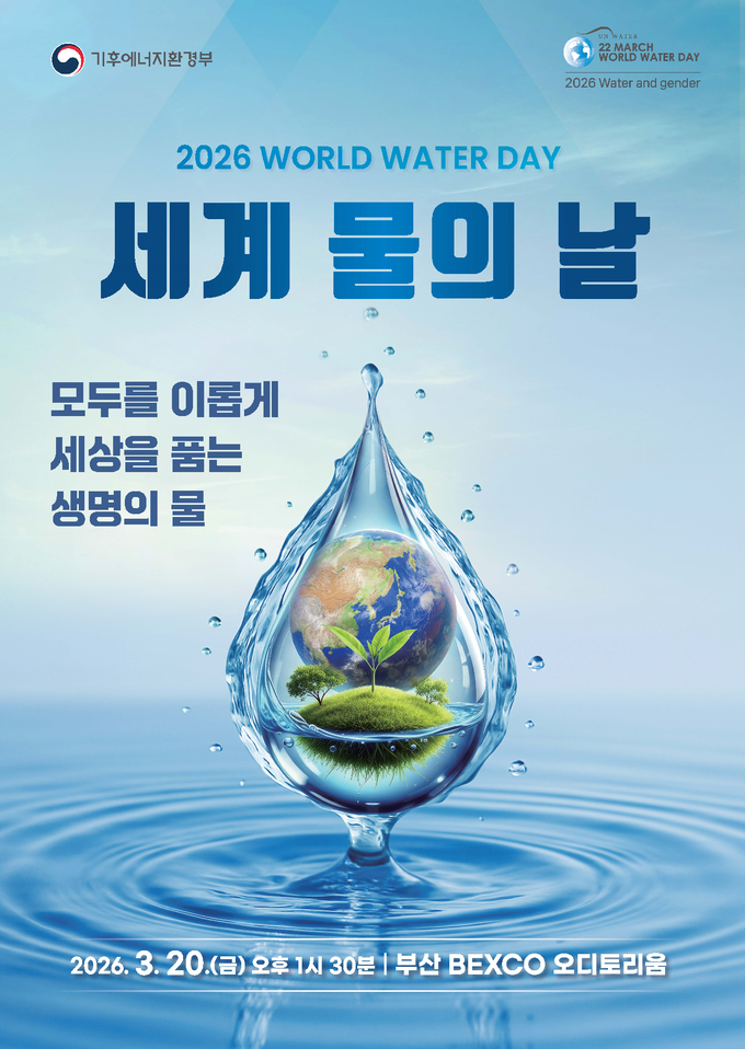 [한국방송/김근해기자] 기후에너지환경부(장관 김성환)는 3월 20일 오후 벡스코 오디토리움(부산 해운대구 소재)에서 2026년 ‘세계 물의 날’ 기념식을 개최한다.