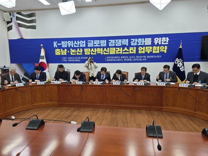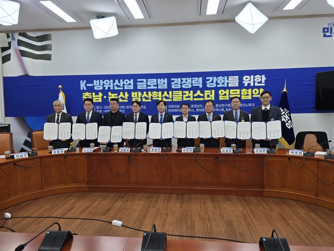 도는 24일 국회에서 황명선 국회의원, 논산시, 한화에어로스페이스·현대로템·LIG넥스원·한국항공우주산업(KAI), 충남연구원·충남테크노파크 등과 업무협약을 체결했다.
