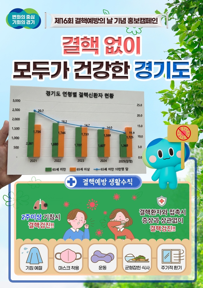 26일 경기도에 따르면 2025년 기준(잠정) 결핵환자는 전국의 경우 1만7,107명(33.5명/10만명 당), 경기도는 3,717명(27.3명/10만명 당)으로 집계됐다. 특히 65세 미만 연령대에서 2021년 전체환자는 2,964명에서 2025년 1,628명으로 45.1% 줄었으며, 신환자(과거에 결핵치료를 받은 적이 없거나 치료기간이 1개월 미만인 자)는 같은 기간 2,381명에서 1,360명으로 42.9% 감소하는 성과를 나타냈다.