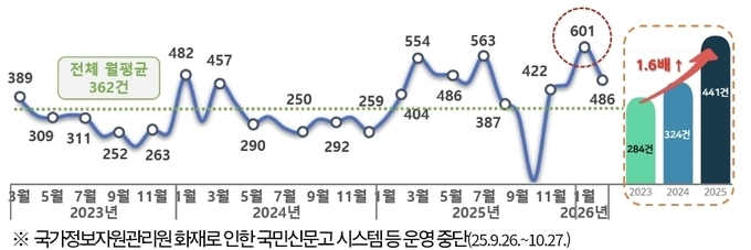 이번 민원 분석 결과, 교육비 관련 민원은 지속적으로 증가하고 있으며, 2025년의 월평균 교육비 관련 민원은 441건으로 2023년 284건 대비 1.6배 증가했다.