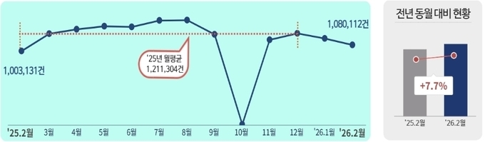 2월 민원 발생량은 약 1,080,112건으로, 지난달 117만 건 대비 7.5% 감소하였으나, 전년도 2월(1,003,131건)과 비교 시 7.7% 증가했다.