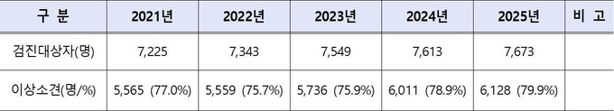 〈최근 5년(’21~’25년), 서울시 소방공무원 특수건강진단 이상소견 현황〉