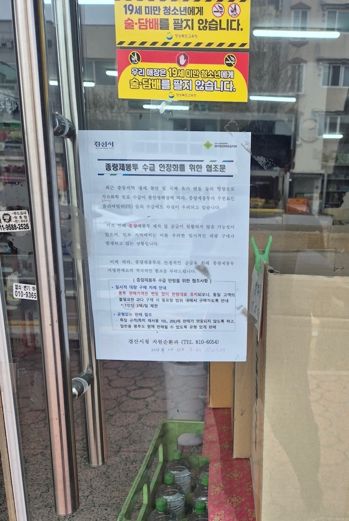 한편, 경산시는 종량제봉투 지정판매소에 다수 인원 밀집 시설 외에 1인 1일 2매 판매 등 종량제봉투 수급 상황을 지속적으로 모니터링하여 시민 불편을 최소화하는데 총력을 다하고 있다.