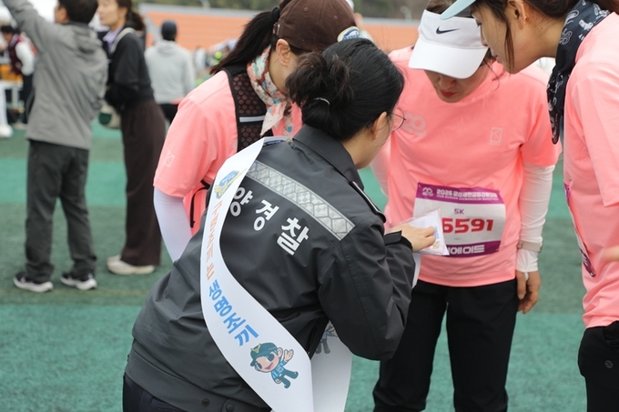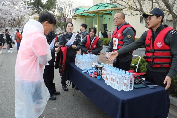 특히, 해경은 마라톤 참가자와 거리에 응원하러 나온 시민들의 갈증 해소를 위해 '구명조끼 착용 생활화' 문구가 적힌 스티커를 부착한 생수를 배부하며 큰 호응을 얻었다.