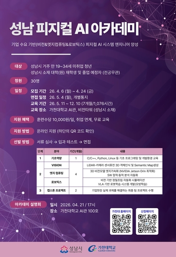 [성남/최동민기자] 성남시(시장 신상진)는 물리 세계와 인공지능(AI)을 결합한 '피지컬 인공지능(AI)(Physical AI)' 분야 핵심 인재를 양성하기 위해 '성남 피지컬 인공지능(AI) 아카데미' 교육생을 4월 24일까지 모집한다.